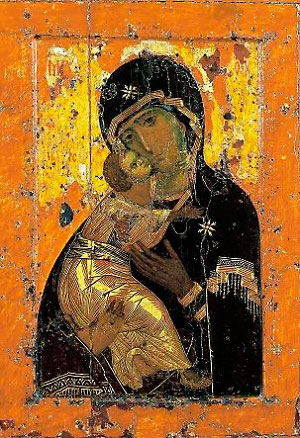 по преданию написана апостолом и евангелистом Лукой. До 5 века образ пребывал в Иерусалиме, а затем был перенесен в Константинополь. В начале 12 века Патриарх Константинопольский послал его в дар великому князю Юрию Долгорукому. Икона была поставлена в Киеве, откуда св. благоверный князь Андрей Боголюбский, сын Юрия Долгорукого, перенес ее во Владимир и поместил в специально для нее построенном Успенском соборе. С тех пор икона именуется Владимирской. От нее совершалось множество чудотворений. В 1395 году ее помощью Москва была спасена от нашествия Тамерлана. Когда десятидневный крестный ход перенес ее в Москву из Владимира, Тамерлан, уже разоривший Рязань и шедший к Москве, без видимых причин повернул назад, убоявшись сна, в котором Божия Матерь повелела ему покинуть пределы Руси. По молитвам народа Владимирской иконе Москва была еще дважды спасена от татарских нашествий (в 1480 и 1521 гг.). Святой образ, почитаемый как главная святыня русской земли, был поставлен в Успенском соборе московского Кремля. Перед ним совершалось избрание и поставление российских митрополитов и Патриархов. Празднование Божией Матери в честь Владимирской Ее иконы совершается 21 мая (3 июня), 23 июня (6 июля) и 26 августа (8 сентября).