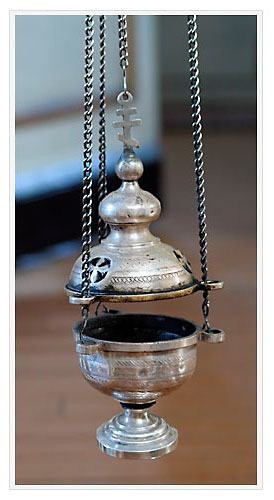богослужебный сосуд для каждения, представляет собой небольшую металлическую (обычно из сплавов меди) чашу, подвешенную на цепочках и носимую священнослужителем. В чашу полагаются горящие угли, на которые всыпается ладан, выделяющий при сгорании благовонный фимиам (благоухающий дым).
