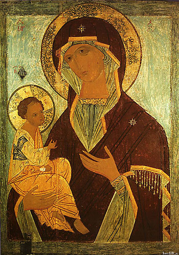 (греч. «путеводительница») – одно из самых распространенных изображений Богоматери, держащей на левой руке благословляющего Младенца. Правой рукой Божия Матерь указывает на Младенца Христа, то есть, является Путеводительницей ко Христу, что и выражено в названии иконы. По преданию, самая первая Одигитрия была исполнена евангелистом Лукой и в середине V века перевезена из Святой Земли в Константинополь Евдокией, женой императора Феодосия. Икона Богоматери Одигитрии пользовалась чрезвычайным почитанием в Византии, списки с нее получили широкое распространение на Руси. К этому типу относятся такие почитаемые иконы, как Смоленская, Иерусалимская (Грузинская), Костромская, Ярославская, Тихвинская, Иверская и др. Сохраняя основной иконографический тип Одигитрии, они различаются в деталях.