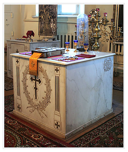 четвероугольный стол посреди алтаря, освященный архиереем для совершения на нем Таинства Евхаристии. Делается из дерева или камня высотой около метра, облачается в две священные одежды – нижнюю (белое льняное покрывало), и верхнюю (светлый шелковый или парчевый плат). На престоле полагаются антиминс, напрестольное Евангелие, крест, дарохранительница и лампада. Как алтарь есть самое священное место в храме, так и престол является самым священным местом в алтаре, на нем таинственно присутствует Слава Божия. Поэтому прикасаться к престолу и проходить перед ним (между престолом и Царскими вратами) имеют право только священнослужители.